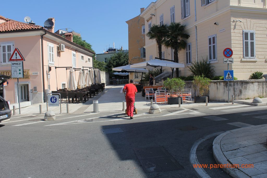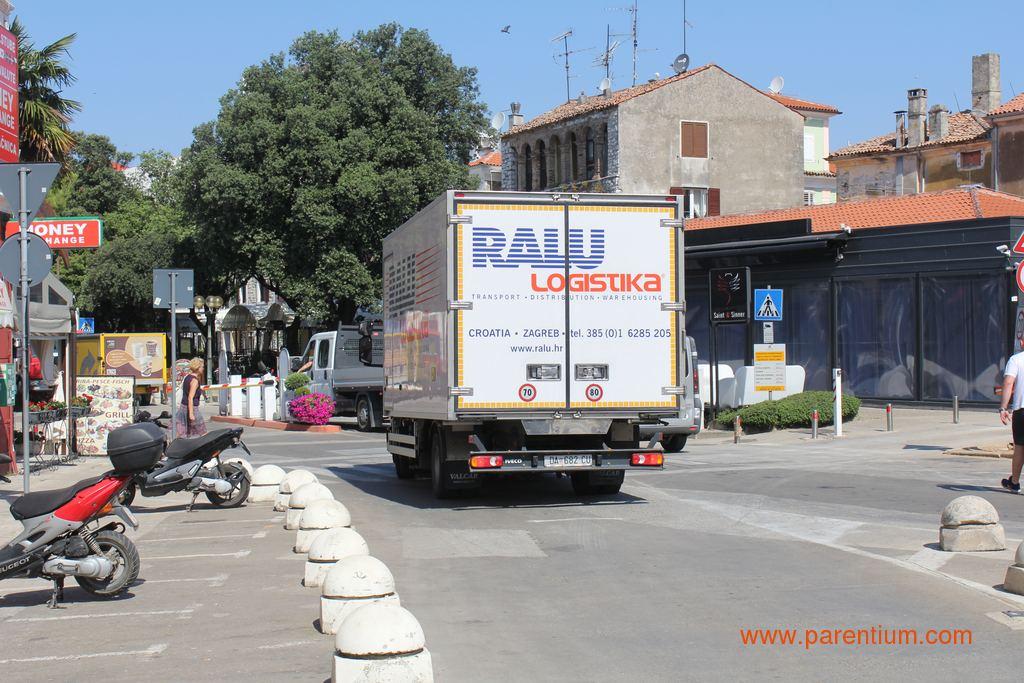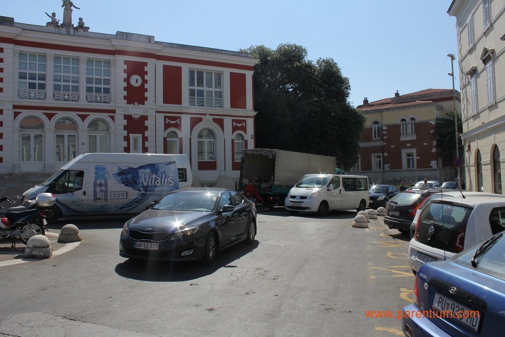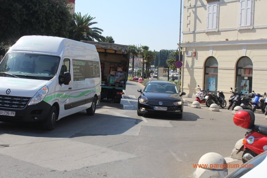 -Neka kod Petretija postave rampu i nema problema, prokomentirao je prolaznik naše fotografiranje današnje nevolje onih koji su se automobilima pokušali probiti do Narodnog trga, na rivu ili u Kandlerovu ulicu. Dostavna vozila po pločnicima i ulicama, na njihovim mjestima osobni automobili, krkljanac na rampi prema hotelu Palazzo... jedan je majstor svoj kamion parkirao pred kinom, pa u dostavu kolicima krenuo prema Decumanusu, drugi je svoj automobil parkirao u lijepome hladu ispod zida Vile Polesini.