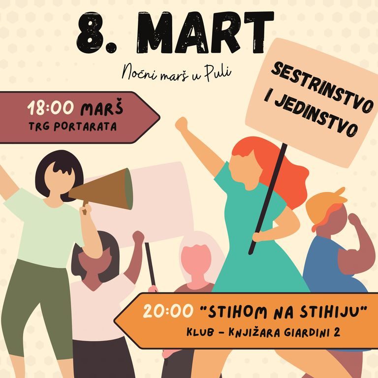 U organizaciji Udruge PANK - Platforme aktivnih nezavisnih kreativaca, Kluba i knjižare Giardini 2 te Udruge Proces, iduće srijede u 18 sati bit će održan Noćni marš u Puli povodom obilježavanja 8. ožujka - Međunarodnog dana žena.