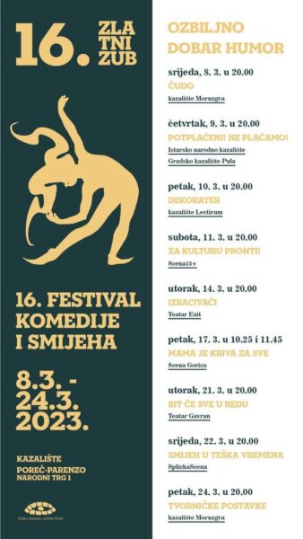 U Porečkom kazalištu, u organizaciji Pučkog otvorenog učilišta Poreč, od 8. do 24. ožujka bit će održan 16. Zlatni zub, festival komedije i smijeha.