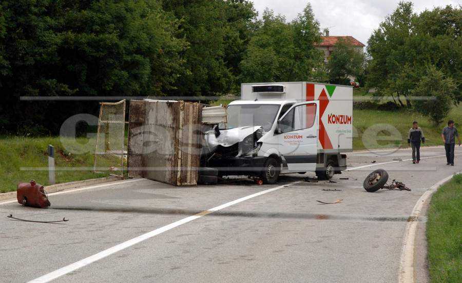 Jedna je osoba ozlijeđena u četverostrukom sudaru šlepera, dvaju manjih kamiona te kombija jutros u 8.30 sati na cesti Baderna - Pazin. Ozlijeđeni vozač kamiona iveco prevezen je na liječenje u pulsku Opću bolnicu.