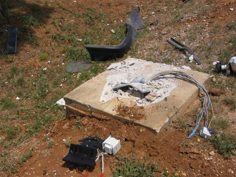 Potpuno uništeno vozilo zaustavilo se van kolnika i okrenulo u smjeru suprotnom od smjera kretanja. Rasvjetni stup je iz temelja iščupan i uništen, a dijelovi vozila razbacani su desecima metara uokolo.