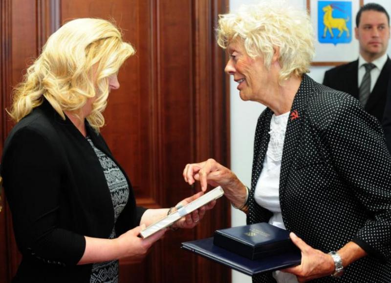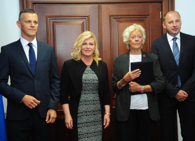Predsjednica Republike Kolinda Grabar-Kitarović i književnica Daša Drndić, kći odlikovanog Ljube Drndića (M. MIJOŠEK)