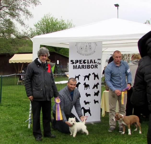 Proteklog su vikenda u Mariboru održane međunarodne izložbe pasa svih pasmina CACIB Maribor i Specijalna izložba SKT (Slovenskog terijer kluba). Na prvoj je američki stafordski terijer Pinto (CH Playmaker's HR Hard Core Dragon) našeg