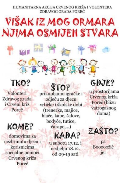 Podsjećamo da će se ovog vikenda u Poreču održati Božićna humanitarna akcija pod nazivom "Višak iz mog ormara njima osmijeh stvara". Volonterke Zdravog grada su u suradnji sa Crvenim križem Poreč odlučile su je pokrenuti kako bi zainteresirane potaknule da "viškom iz svog ormara" pomognu potrebitima uljepšati ove blagdanske i hladne dane.