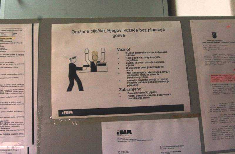 Ujutro nakon pljačke posjetili smo benzinsku i zatekli voditelja smjene koji je pisao izvještaj o razbojstvu. Na naše upite nisu nam davali informacije jer, kažu, nisu nadležni za to. No, primijetili smo da je na vratima kancelarije izvješena obavijest što raditi, a što ne u slučaju razbojstva ili nekih drugih neželjenih situacija.