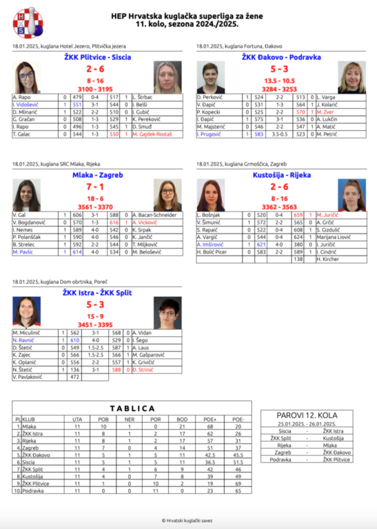 Kuglačice Ženskog kuglačkog kluba Istra Poreč protekle subote, 18. siječnja u Poreču odigrale su utakmicu 11. kola HEP Hrvatske Superlige za žene, gdje su u napetom dvoboju svladale ekipu Splita rezultatom 5:3. Pobjeda je donijela važna dva boda, čime su porečke igračice potvrdile stabilnu formu u ovoj sezoni.