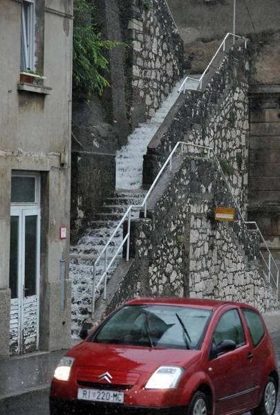 U Rijeci su najveće količine kiše pale upravo između 12 i 14 sati, a velike bujice uzrokovale su začepljenja šahtova, poplave na prometnicama te zastoje u prometu. Po javljanjima Riječana, izbijeni šahtovi na Krimeji i Bulevardu uzrokovali su štete na nekoliko osobnih automobila, a poplavljeni su i brojni kafići u gradu.