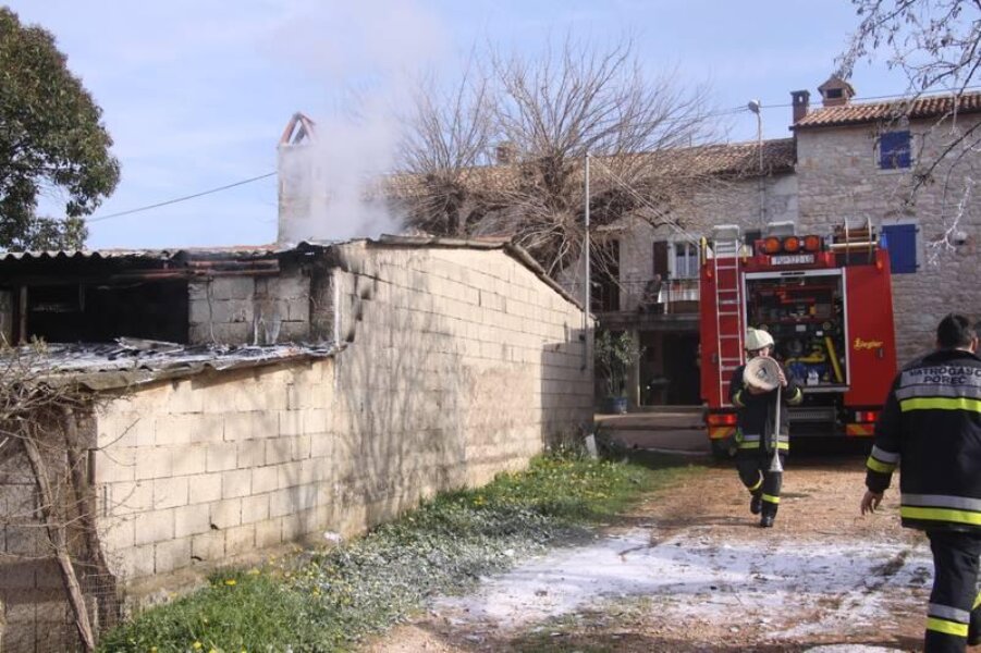Pripadnici Javne vatrogasne postrojbe Poreč i porečki policajci danas su zbog požara intervenirali u selu Radoši. Kako nam je vlasnik kuće rekao, do požara je došlo zbog iskrenja prilikom korištenja električne brusilice. Njome je, naime, skidao "zapečeni" vijak kako bi automobil mogao odvesti na tehnički pregled. -Otišao sam u Poreč kad su me nazvali da mi gori radionica, rekao je.