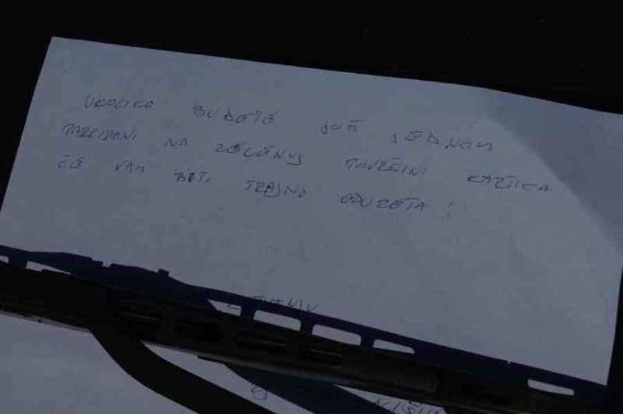 Komunalni redar zabilježio je slučaj svojim fotoaparatom i poduzeo adekvatne mjere, pod brisačem vjetrobrana vidjeli smo poruku kojom se vozaču prijeti ukidanjem kartice... pa eto, da i mi ovjekovječimo taj biser.