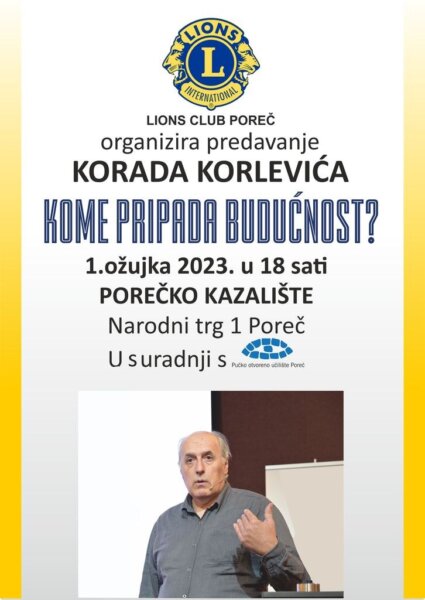 U srijedu, 1. ožujka u 18 sati Korado Korlević gost je predavač u porečkom kazalištu s temom "Kome pripada budućnost". Predavanje je organizirano u suradnji Lions kluba Poreč i Pučkog otvorenog učilišta Poreč, a ulaz je slobodan.