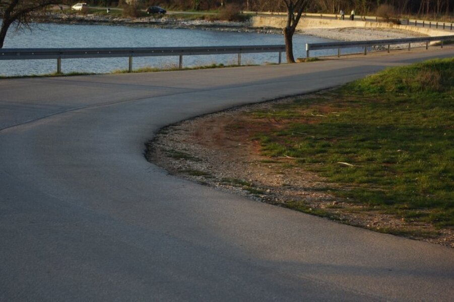 Kamen iz podloge ceste se odvaja i kotrlja prema plaži