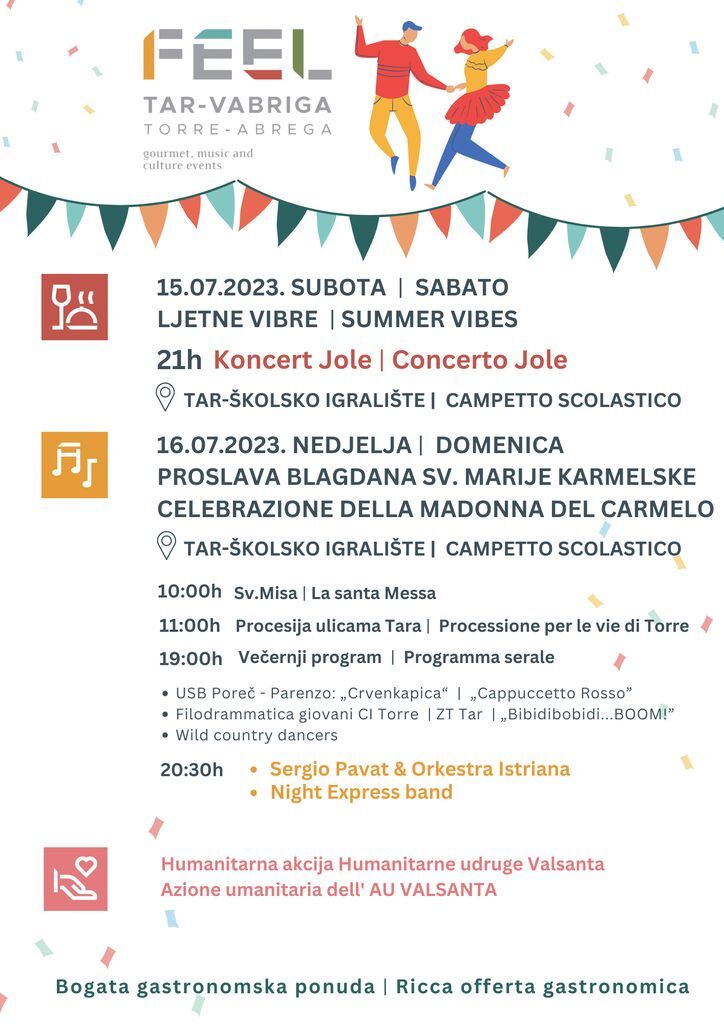 Proslava blagdana Sv. Marije Karmelske u Taru, koja će se održati 15. i 16. srpnja, donosi program događanja za posjetitelje. Tako će 15. srpnja u 21 sat na školskom igralištu biti održan koncert pjevača Joleta.