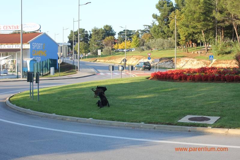 Građani se već dulje vremena žale na pse bez nadzora u blizini sportske dvorane na Žatiki, a i mi smo ih jučer zatekli u igri na kružnom raskrižju kod Parensa. Malo se igraju na travi, malo istrčavaju na kolnik i tjeraju vozače na neuobičajene manevre kočenja i izbjegavanja.