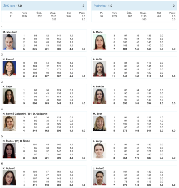 Nakon impresivne pobjede i rekordnog nastupa, kuglačice Istre Poreč zadržale su četvrto mjesto na prvenstvenoj ljestvici, učvrstivši svoju poziciju u sredini tablice. Iznenađenje kola donio je poraz riječke ekipe u Sisku, što je omogućilo ekipi Mlaka da se izdvoji na vodećem mjestu. U nadolazećem kolu, kuglačice Istre očekuje izazovan derbi susret u Zagrebu protiv istoimenog kluba, koji se nalazi na trećem mjestu, samo jedan bod ispred njih.