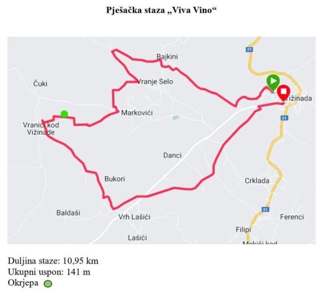 ", duljine oko deset kilometara. Polazak pješačke ture je u 10:15 sati, a prolazi rutom ovogodišnjeg vinskog događaja "Viva Vino".