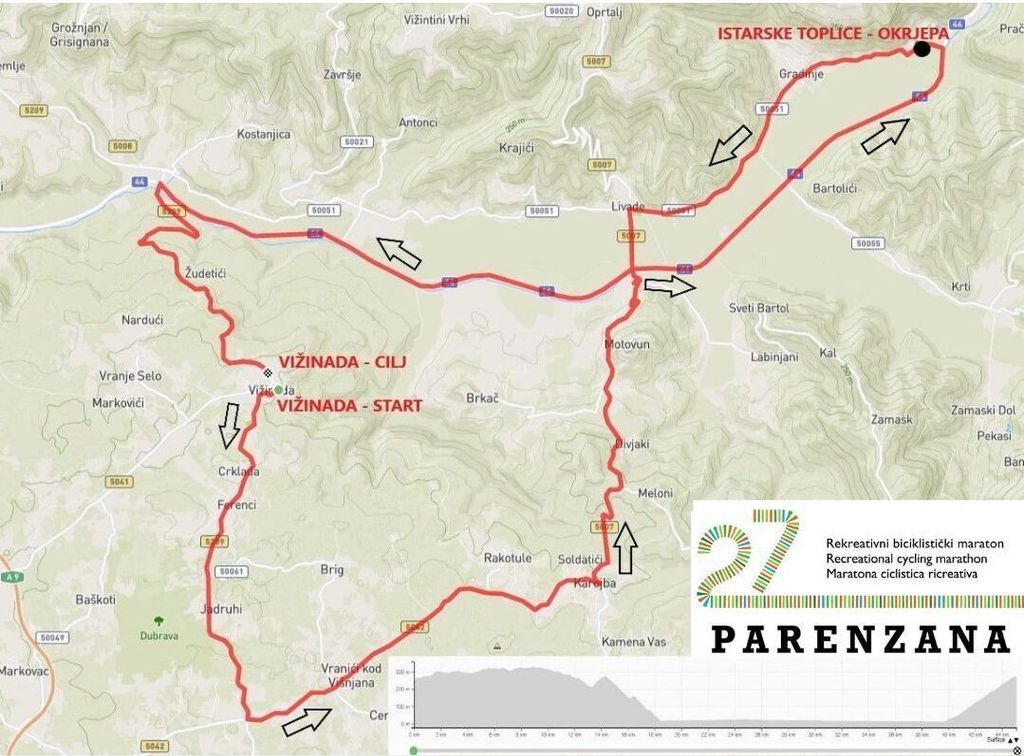 Rekreativni biciklistički maraton Parenzana vodi sudionike kroz neke od najljepših dijelova Istre, duž trase nekadašnje željezničke pruge Parenzana. Ruta je duga 46,7 kilometara, u potpunosti asfaltirana, što omogućava sudionicima ugodno bicikliranje uz uživanje u prirodnim ljepotama. Trasa prolazi kroz Tićan, Karojbu, Motovun, Istarske toplice i Livade, s okretištem kod mosta Mirna. Povratak je kroz Ponte Porton, a cilj je ponovno u Vižinadi.
