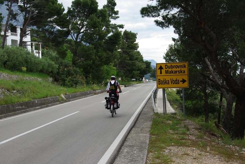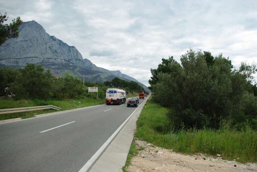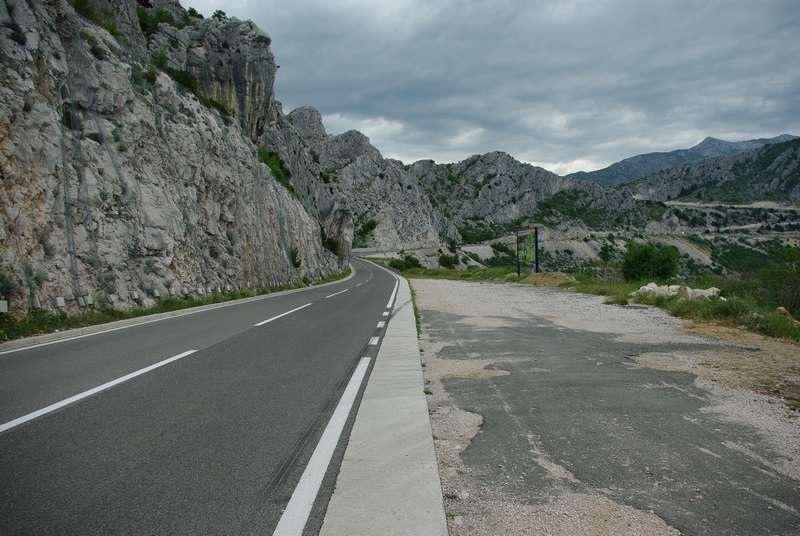 Dan je malo oblačan i strepim zbog mogućnosti oborina, makar su nam sve prognoze naklonjene. Cesta i mjesta uz nju su slikovita, ali promet je pregust. Zato vozim koncentrirano po desnoj rubnoj crti i stalno buljim u retrovizor! Kamion za kamionom. Cesta koja je inače odlična, najoštećenija je upravo na rubovima. Koliko sam samo rupa pogodio! Bajs sve to dobro podnosi. Na potezu do Omiša izdvojio bih mjesto Duće kao vrlo simpatično, te plažu u Dugom ratu kao prekrasnu (još samo da im maknu krug one bivše tvornice. Zbilja je zločinac onaj koji je odlučio tamo napraviti tvornicu…usred onakve ljepote!)