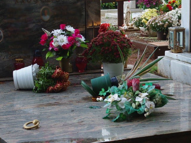 Veliki dio cvijetnih aranžmana bio je isprevrtan nakon nevremena koje je poprilično iza nas, a da na groblju nismo vidjeli ni jednog njegovog radnika koji bi se bavio popravljanjem štete, iako je veći dio dana bio primjeren takvim aktivnostima. Na groblju smo zatekli tek jedan kamion u vlasništvu privatnog kamenoklesara, koji je bio parkiran u perivoju.