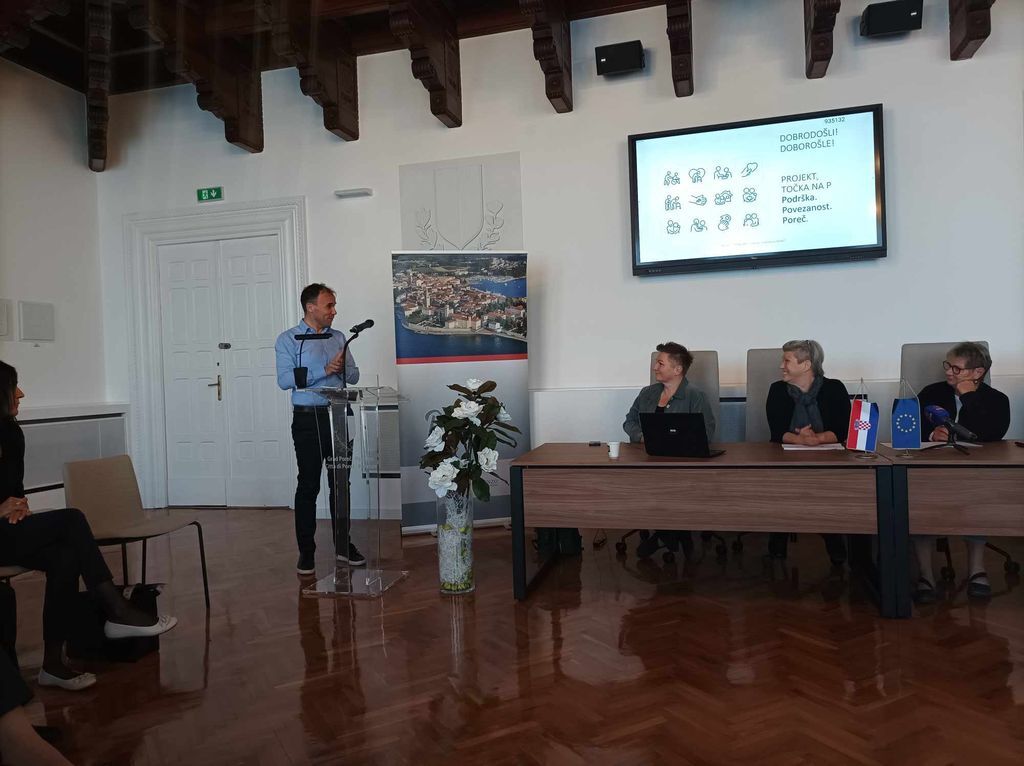U Velikoj vijećnici Grada Poreča održana je u ponedjeljak, 16. listopada završna konferencija projekta "Točka na P – Podrška. Povezanost. Poreč". Na konferenciji su se okupile predstavnice i predstavnici različitih sektora i institucija, a gradonačelnik Loris Peršurić istaknuo je važnost suradnje između Grada Poreča, Društva "Naša djeca" Poreč, Centra za građanske inicijative Poreč te drugih udruga koje djeluju na poboljšanju uvjeta života u gradu Poreču.