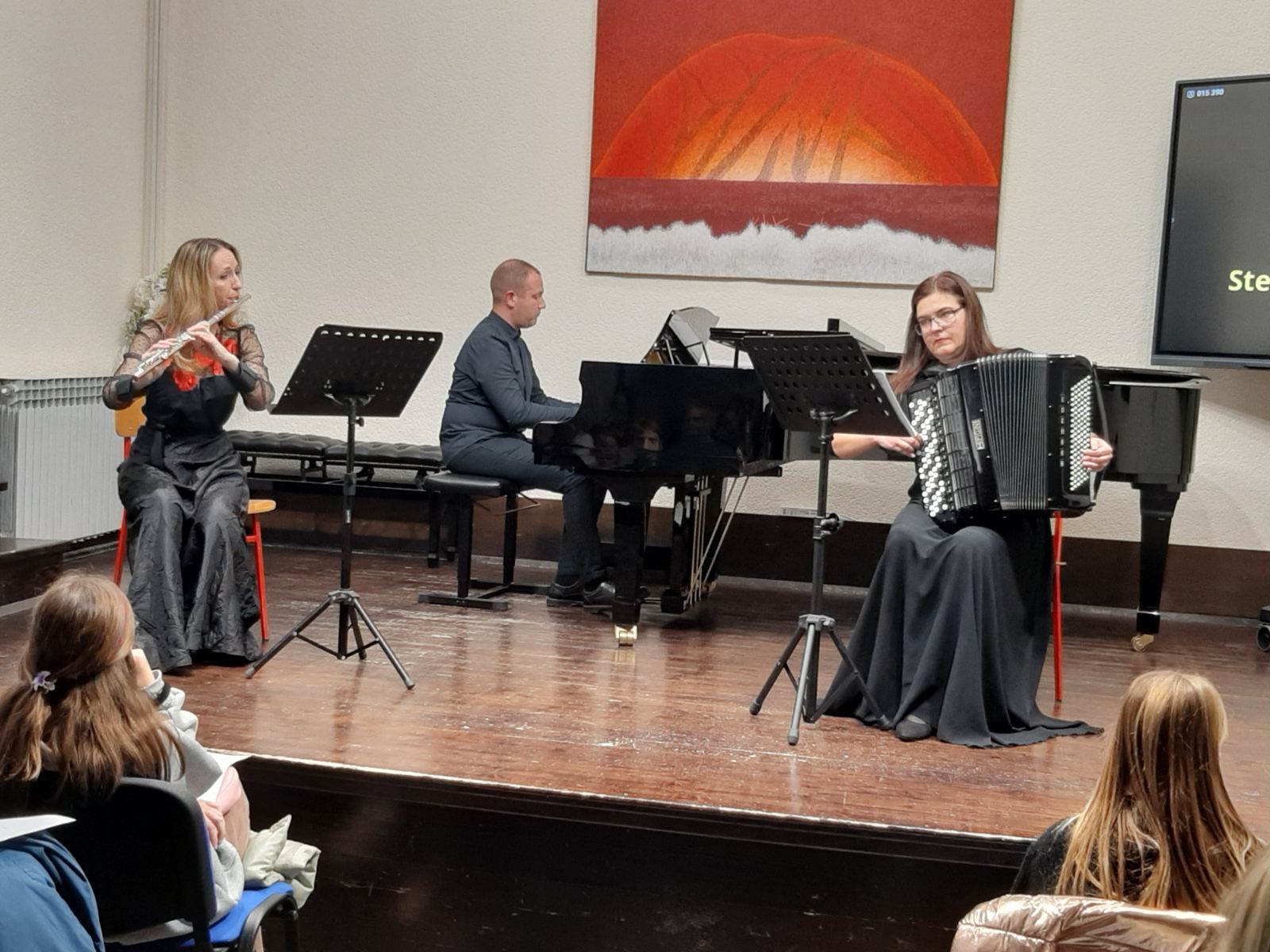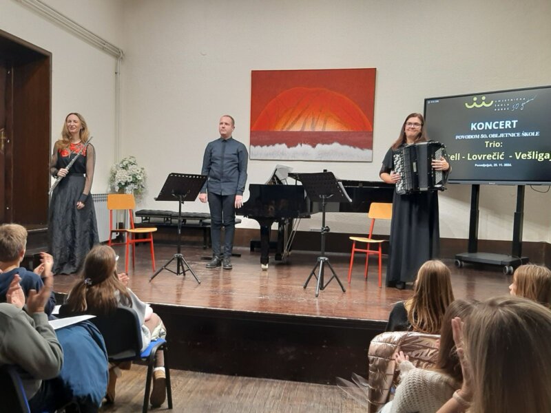 Samanta Stell na flauti, Anamarija Lovrečić na harmonici i Sandro Vešligaj za klavirom otvorili su koncert živahnim Marschem n.3 A. Wiltenbergera, u aranžmanu Vešligaj i Lovrečić (izvorno je pisan za dva klavira i violinu). Posebno je zanimljiva bila izvedba Romance op.27 C. Saint-Saensa u kojoj je klavir na trenutke zvučao kao harfa. Središnji dio koncerta ispunile su dvije skladbe za duete: Stell – Vešligar izveli su Sonatu za flautu i klavir FP164 F. Poulenca a Stell-Lovrečić Pet španjolskih plesova M. Moszkowskog. Vrhunac koncerta ispunile su izvedbe skladbe Šegun-Šegać naše Đeni Dekleva-Radaković i Tango istiano op.81 Puležana L. Demarina. Publika ih je pratila aplauzima udivljenja, a na kraju koncerta grupa učenika škole zahvalila im je cvijećem.