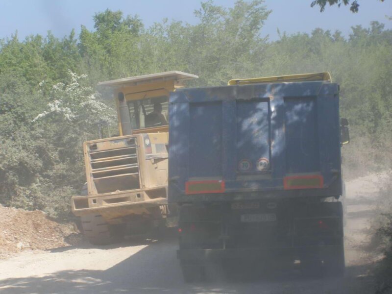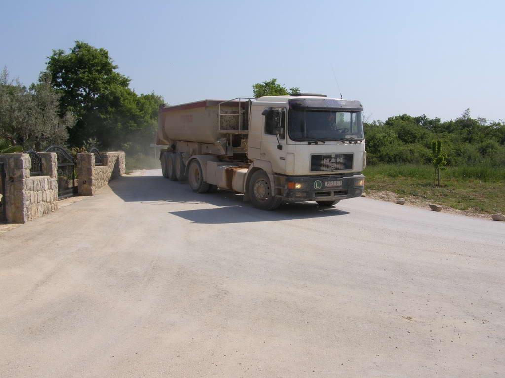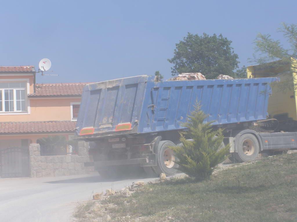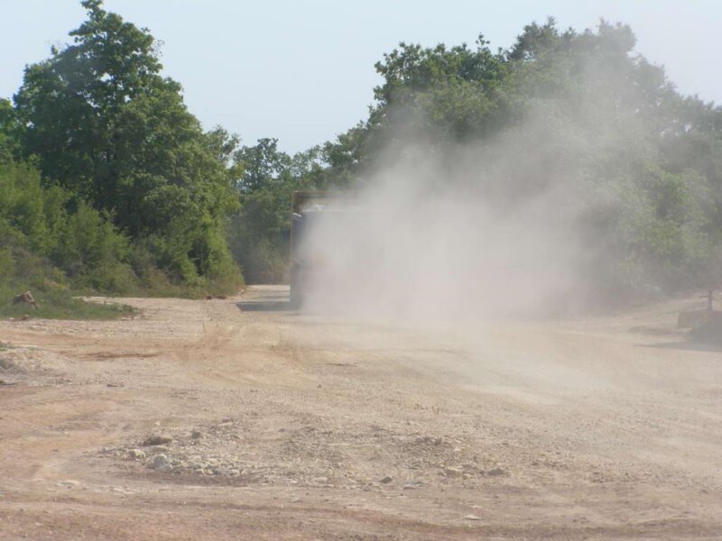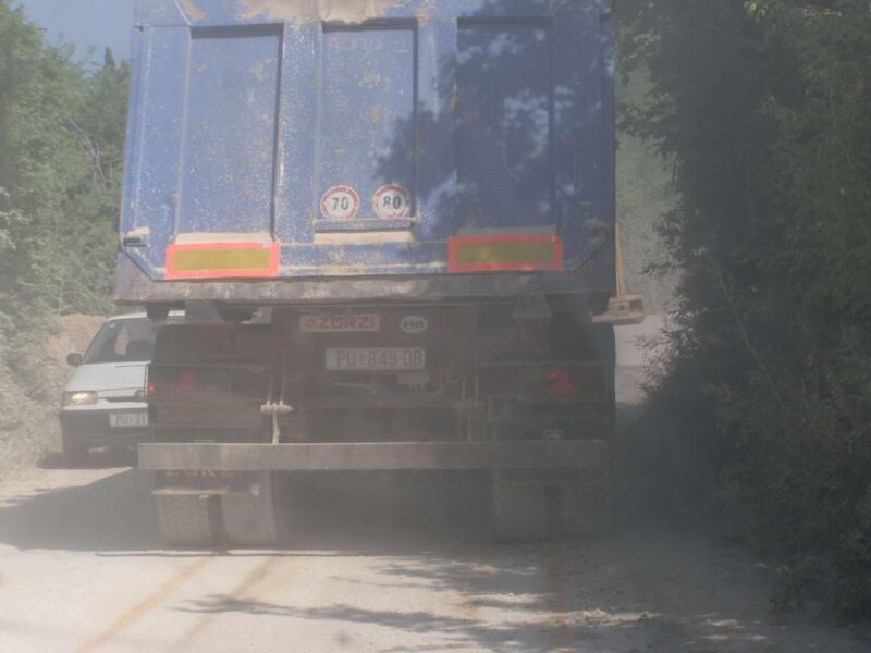 [slika4]Napravili smo automobilom jedan đir prema kamenolomu i natrag, dug ukupno oko jednog kilometra i doživjeli sljedeće: automobil nam je bio prekriven prašinom koja se uvukla svuda: u blatobrane, ispod poklopca motora, zacementirali su se otvori na hladnjaku, a sve zato što smo dio puta vozili iza jednog kamiona koji je vozio blokove kamenja. Putem se susreo sa službenim vozilom koncesionara kamenoloma i sa bagerom koji neprekidno ravna cestu, nanosi nove slojeve pijeska, kako bi mrcine teške nekoliko desetaka tona mogle nesmetano voziti. Iako voze vrlo malom brzinom, na snimljenim fotografijama možete vidjeti kako je vidljivost na trenutke praktički – nula metara.