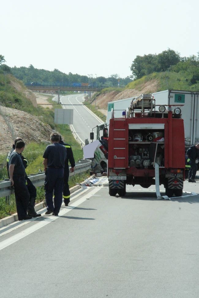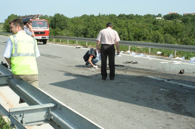 Iako tragovi kočenja kamiona počinju na desnoj a završavaju na lijevoj strani ceste uz ogradu, i policajcima na uviđaju je teško reći kakav je bio slijed događaja, pa ćemo o tome izvijestiti kad dobijemo konkrente informacije iz PU Istarske.