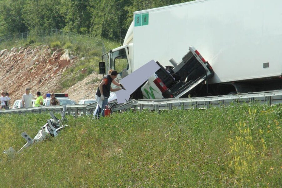 Scena koja je vaše izvjestitelje zatekla na mjestu nesreće doista je strašna: porečki su vatrogasci pneumatskom opremom izrezali kombi vozilo te iz njega izvukli teško ozlijeđenu osobu. Kamion se nalazi na lijevoj strani prometnice gdje je, između njega i ograde, stiješnjen i zgnječen kombi sa posmrtnim ostacima vozača i pet putnika.