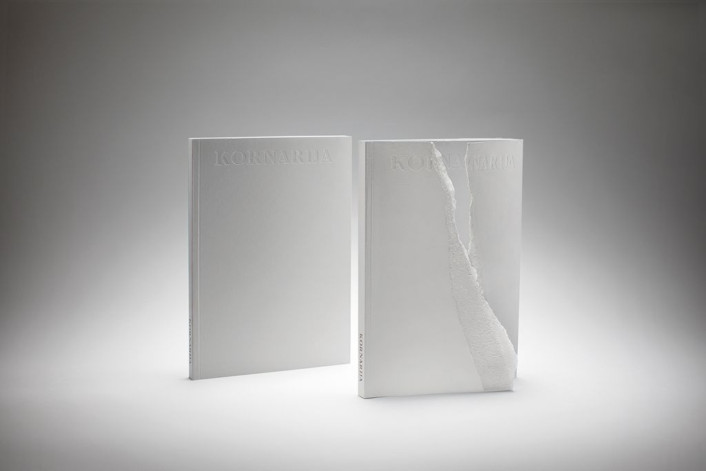 Godine 1980. u istarskom mjestu Marušići osnovana je Međunarodna škola skulpture "Kornarija". Pučko otvoreno učilište Buje povodom 40. godišnjice škole odlučilo je je izdati istoimenu knjigu kako bi se javnost upoznala s utjecajem ove specifične lokacije u Istri na svijet kiparstva. Ta atipična priča zahtijevala je i nesvakidašnji koncept za izradu monografije. Vodeći se za Aristotelovom izrekom o kiparstvu: " …kao da je oblik bio zarobljen, utopljen u masu, a kipar ga je oslobodio odstranjujući suvišnu, vanjsku oblogu...", knjiga je dizajnirana na način da omot/korice podsjećaju na kamen. Svatko modelira svoju knjigu trganjem korica na svoj, jedinstven, način. Sadržaj je sa svih strana zatvoren te je potrebno otrgnuti omot kako bi mu se pristupilo. No, odabiri gdje će i kako otrgnuti omot, te na taj način napraviti jedinstveni otvor – svojevrsnu skulpturu, ostavljeni su samom čitatelju. Korice nakon trganja, odnosno "modeliranja”, ostaju zalijepljene za hrbat knjige i korisniku tako ostaje jedinstveni primjerak djela kojega je i sam autor. Dodatno, naslov knjige izveden je u slijepom tisku te bez boje, kako se ne bi remetio osjećaj i koncept kamena, već se i udubljenim naslovom asocira na klesanje i natpis u kamenu.