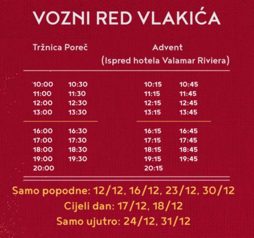 Na Advent Poreč možete i besplatnim vlakićem, koji će prometovati svakog petka, subote i nedjelje, a vozni red provjerite u privitku.