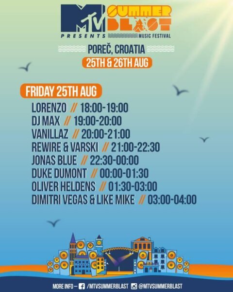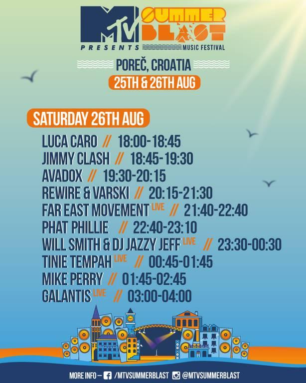 Podsjećamo, drugo izdanje festivala MTV SummerBlast u Poreč prvog dana dovodi mega zvijezde Dimitri Vegas & Like Mike, Oliver Heldens, Duke Dumont, Jonas Blue, R3wire & Varski te domaća pojačanja Vanillaz, DJ Maxa i Lorenza. Drugi dan rezerviran je za britanskog repera Tinie Tempaha, švedskog DJ-a i producenta Mike Perryja, hip-hop i dance trio Far East Movement, a vrhunac večeri svakako je nastup najveće zvijezde današnjice Will Smitha koji u Poreč stiže sa svojim prijateljem DJ Jazzy Jeffom.