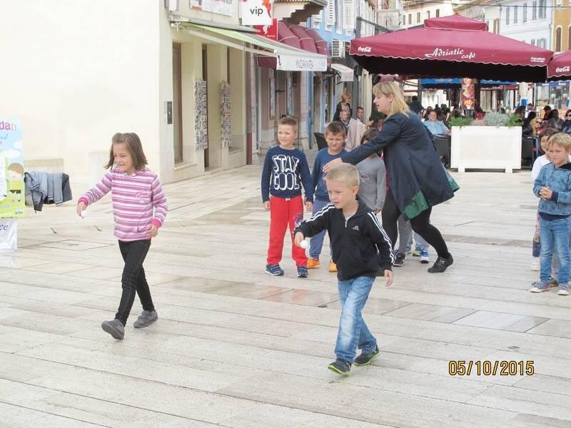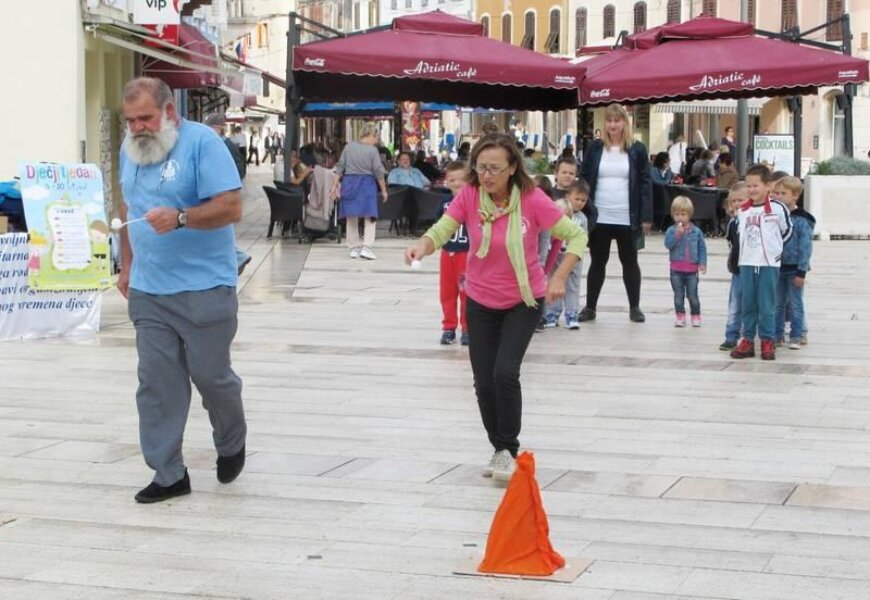 Vrtićke skupine djece dolazile su na trg i uskakale u aktivnosti djece koja su već bila tamo. Igrali su se prenošenja teniske loptice u žlici oko čunjeva, trčali štafetu, plesali do iznemoglosti – uključila su se i djeca koja su tuda prolazila s roditeljima, ali i stariji turisti. Tko bi odolio šarenom živom klupku?!