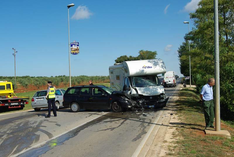 [slika1d]Jutros nakon 10 sati došlo je do teže prometne nesreće na sjevernom ulazu u Poreč, na ”Y” raskrsnici za Veli Maj i Mali Maj. Sudarili su se osobno vozilo i kamper talijanskih registracijskih oznaka, a do trenutka zaključenja ovog članka nismo uspjeli doznati broj putnika u osobnom automobilu, kao ni stupanj njihovih ozljeda. U kamperu se, osim neozlijeđenog sredovječnog muškarca, vozila njegova supruga. Vidno potresen, rekao nam je kako je dobila jak udarac u prsa i noge, te da se ni jedan zračni jastuk u kamperu, ni vozački ni suvozački, nije aktivirao.