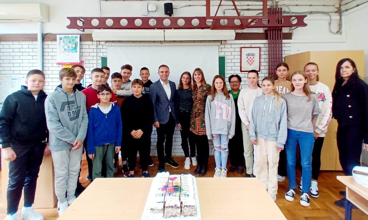 Osim gradonačelnika Lorisa Peršurića, susretu u 7b razredu prisustvovale su i ravnateljica škole Marija Mufić Santin i stručna suradnica Jasna Vučak, dok je mentorica, učiteljica likovnog Marija Cvitković-Nadenić bila spriječena doći.