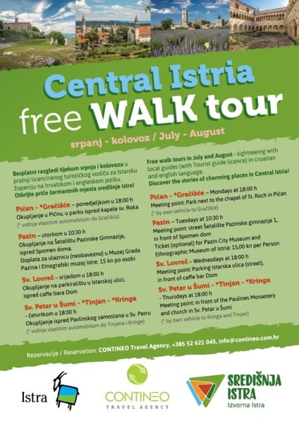 Turistička zajednica središnje Istre organizira besplatne obilaske Pićna i Gračišća, Svetog Lovreča te Svetog Petra u Šumi, Tinjana i Kringe. Besplatni razgledi odvijat će se tijekom srpnja i kolovoza uz pratnju turističkog vodiča, na hrvatskom i engleskom jeziku.