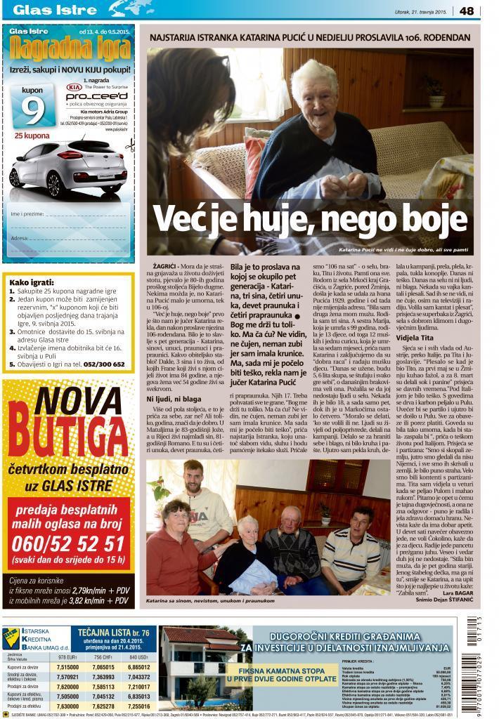 - Po bojžoj volji se gre i živi. Budite pravi, delajte i budite pošteni, kazala je Katarina na svoj 103. rođendan, dok je na predlanjskoj proslavi kazala: "Bog me drži tu toliko. Ma ča ću? Ne vidin, ne čujen, neman zubi jer sam imala krunice. Ma sada mi je počelo biti teško." Neka joj je sretno na drugom svijetu. (A. DAGOSTIN)