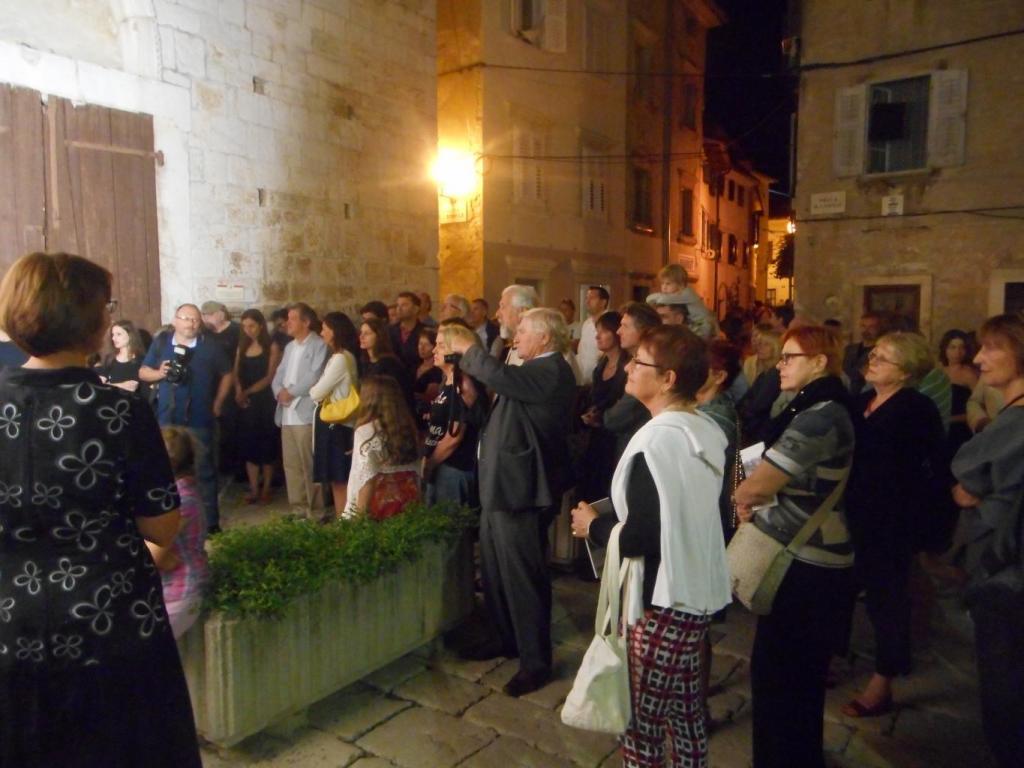 Preksinoćnu izložbu je otvorila dogradonačelnica Poreča Nadia Štifanić Dobrilović uz nazočnost ravnatelja porečkog Pučkog otvorenog učilišta Elija Štifanića. Izložba je na otvaranju bila dobro posjećena, a službeni su govori održani ispred ulaza u sabornicu, na lijepom malom trgu osvijetljenom reflektorom. Našlo se tu puno umjetnika novije generacije koji se bave video i konceptualnom umjetnošću pa je očito to bila prilika i za razmjenu iskustava s jedne i druge strane, uz skromnu zakusku. (Elio VELAN)