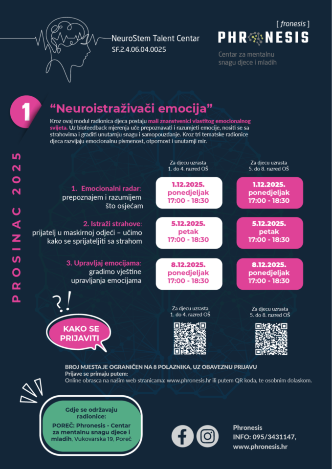 Za učenike od 1. do 8. razreda osnovne škole pripremljen je modul "Neuroistraživači emocija", koji uključuje tri radionice: "Emocionalni radar", "Istraži strahove" i "Upravljaj emocijama". Djeca kroz praktične aktivnosti uče prepoznati i imenovati svoje emocije, razumjeti poruke strahova te razviti strategije smirenog reagiranja u izazovnim situacijama.