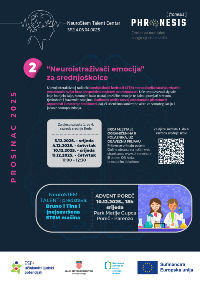 Centar Phronesis najavljuje prosinački ciklus edukativnih aktivnosti za djecu i mlade u sklopu projekta NeuroSTEM Talent Centar, s fokusom na razumijevanje emocija kroz moderne metode neuroznanosti, biofeedback tehnologiju i interaktivne STEM sadržaje.