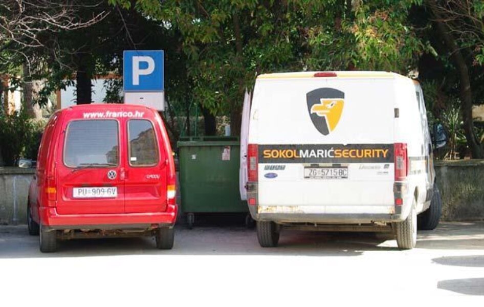 Na samom kraju te ulice, PBZ ima dva rezervirana parkirališna mjesta, dok njihovi zaštitari svoju "blindu" parkiraju na mjestu predviđenom za vozila invalida.