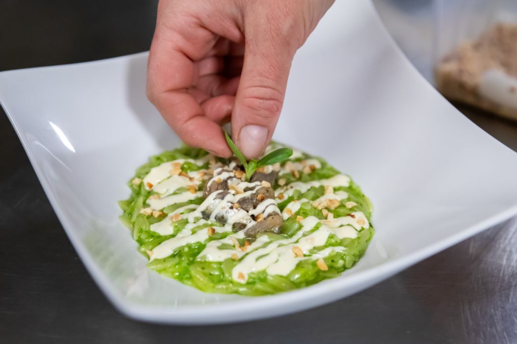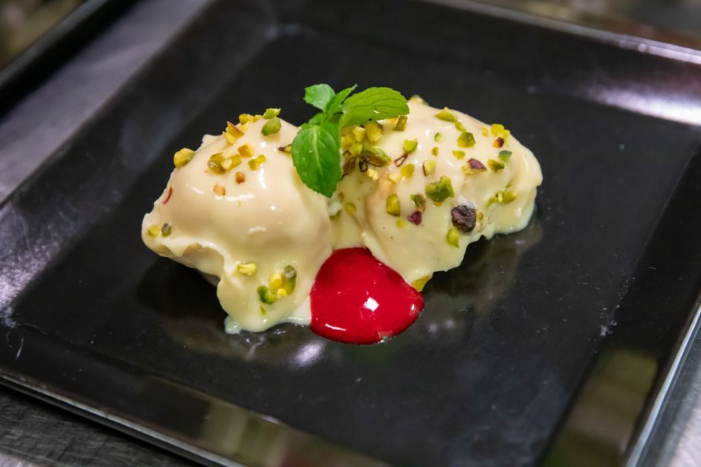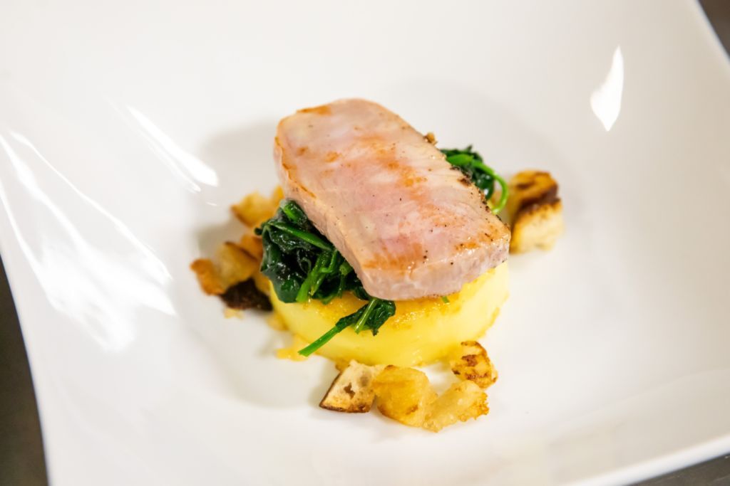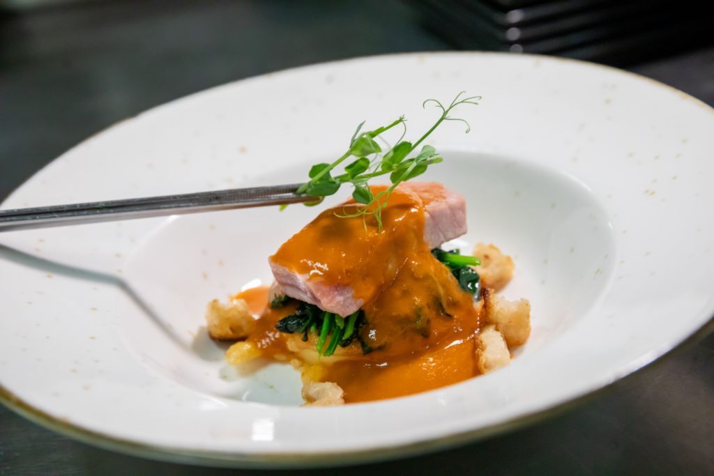 Večera je započela uvodom u svijet istarskih okusa s trisom inćuna, u kombinaciji s Rosé Amalia iz 2023. godine (vina Anđelini, Pazin). Nastavilo se s jedinstvenim spojem tjestenine obogaćene pestom verde, dimljenom plavom ribom i bademima, a ovo jelo dodatno je naglasio aromatični Cabernet Sauvignon iz 2022. godine (vina Sosich, Lašići). Kao glavno jelo, poslužen je brodet od tune s rimskim njokima, špinatom i hrskavim krutonima od kruha, uz koji je pristajao Cabernet Sauvignon iz 2021. godine (vina Siljan, Šegotići). Na kraju, večera je zaokružena slatkom simfonijom – desertom pistacija, bijele čokolade i maline, koji je uparen s vinom Porat Antenal iz 2009. godine (vina Roxanich, Motovun).