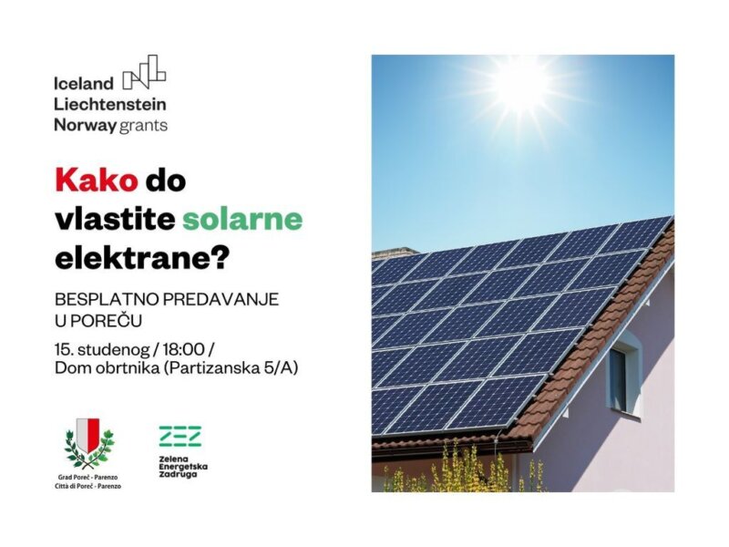 Grad Poreč i Sunčani ured, u suradnji sa Zelenom energetskom zadrugom (ZEZ), pozivaju sve zainteresirane građane na besplatno informativno predavanje na temu: ''Kako do vlastite solarne elektrane?''. Bit će održano u srijedu, 15. studenog u 18 sati, u kongresnoj dvorani Obrtničkog doma Poreč, na prvom katu.