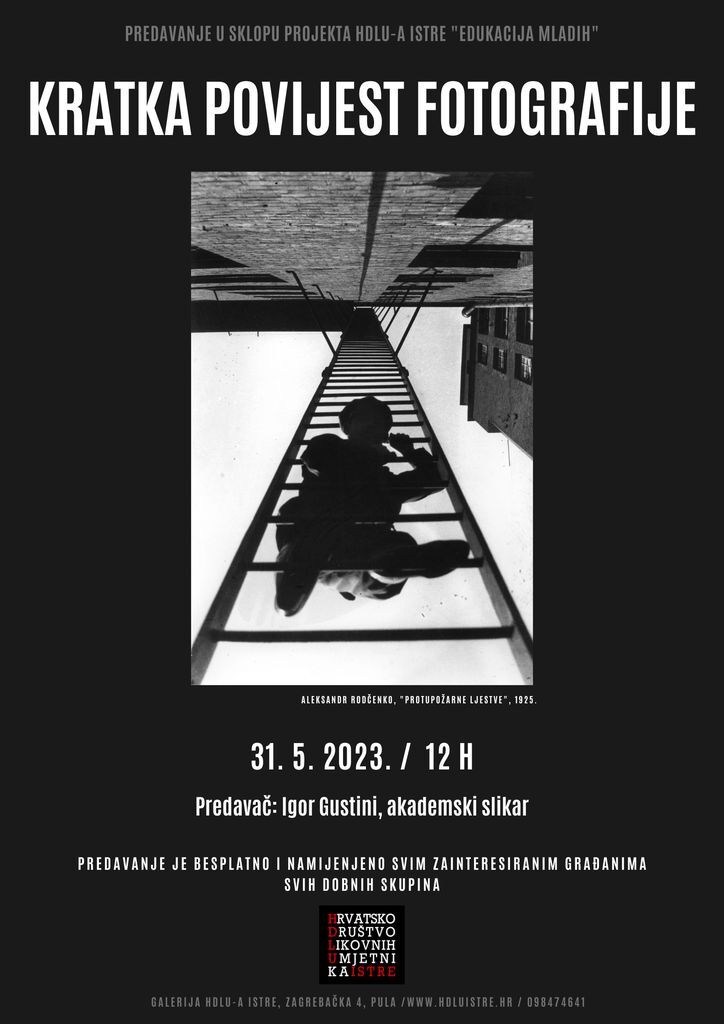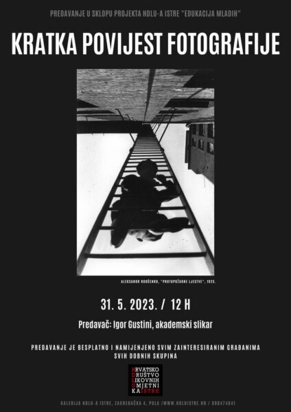 Predavanje je naslovljeno "Kratka povijest fotografije" - Kako i zašto je nastala fotografija, Fotografija jučer i danas, Je li fotografija umjetnost?