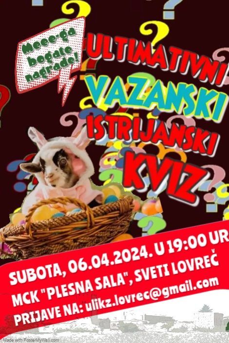 U Multimedijskom centru kreativnosti "Plesna sala Lovreč" u subotu, 6. travnja u 19 sati bit će održan Ultimativni istrijanski kviz, kao treće kolo Ultimativne kviz lige.