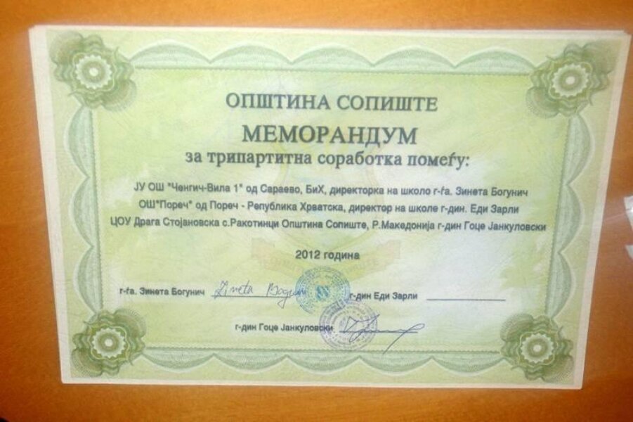 Kako je projekt međunarodnog karaktera, ravnateljica OŠ "Čengić Vila 1" Zineta Bogunić i ravnatelj OŠ "Draga Stojanovska" Goce Jankulovski potpisali su ugovor o suradnji, a to će naknadno učiniti i ravnatelj OŠ "Poreč" Edi Zarli koji zbog obveza nije bio u Sarajevu. Rezultati projekta predstavljeni su na svečanoj priredbi kojoj su prisustvovali i predstavnik veleposlanstva Republike Hrvatske, predstavnici Općine Novo Sarajevo i građani Sarajeva. Sudionici projekta su na održanom okruglom stolu zaključili da se suradnja nastavi i naglasili kako očekuju bolje razumijevanje i potporu u svakoj sredini u kojoj se on realizira.