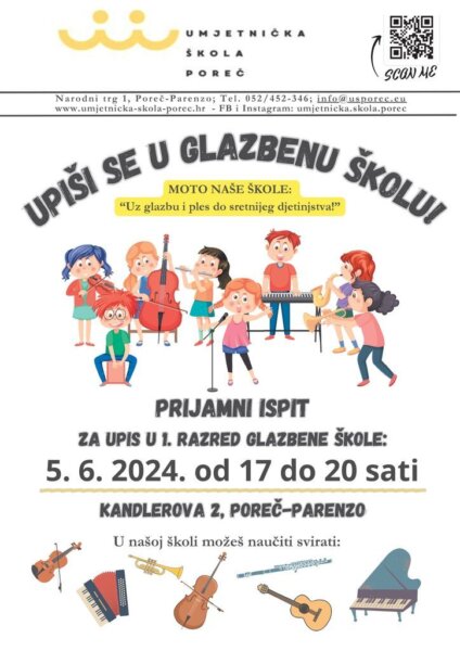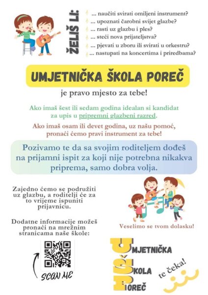 Prijamni ispit za upis u osnovnu glazbenu školu održat će se u Umjetničkoj školi Poreč, Kandlerova 2, Poreč, u sljedećim terminima: