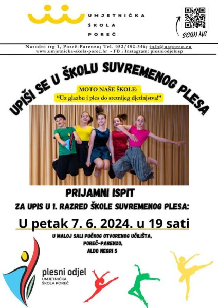 Prijemni ispit za upis u osnovnu školu suvremenog plesa održat će se u Maloj sali Pučkog otvorenog učilišta Poreč, Aldo Negri 5, u sljedećem terminu: