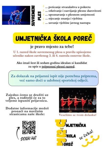 Umjetnička škola Poreč raspisala je javni natječaj za upis u prvi razred osnovnog glazbenog obrazovanja i prvi razred osnovnog plesnog obrazovanja za školsku godinu 2024./2025.