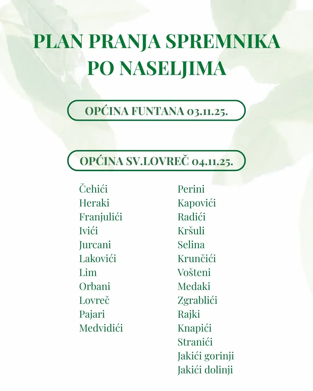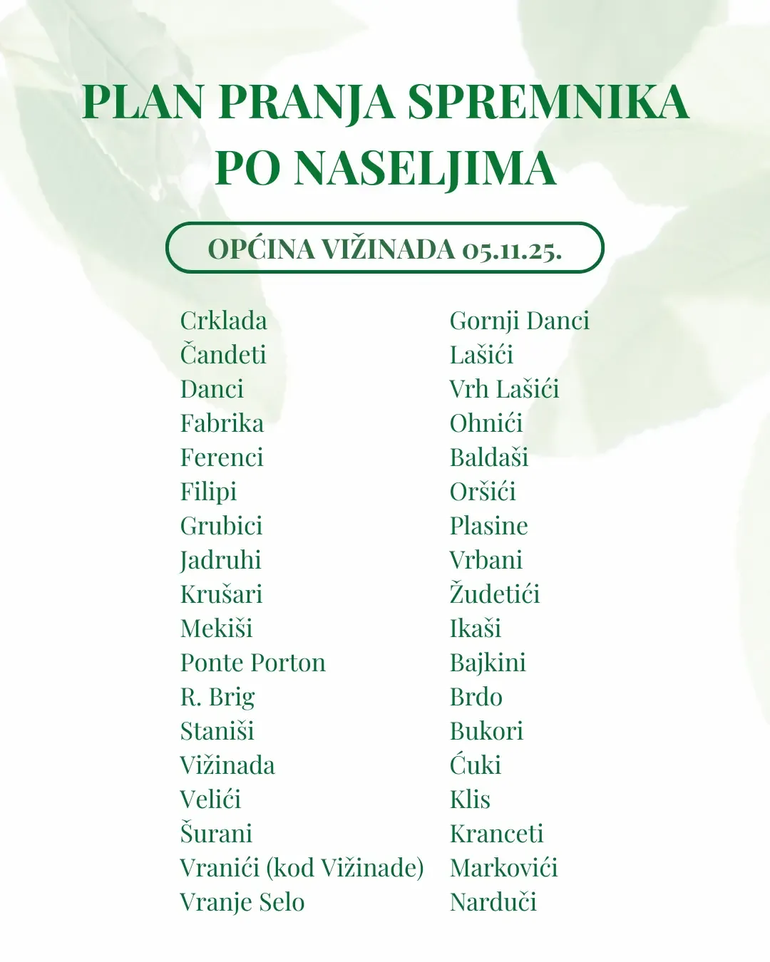 Korisnici se mole da svoje individualne spremnike pripreme na vrijeme po novom tjednom rasporedu po naseljima.