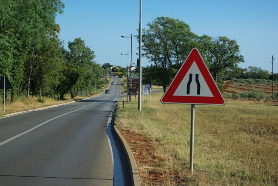 Nekoliko metara dalje stoji znak koji vozače upozorava na suženje kolnika. To samo po sebi ne bi bilo ništa loše kad znak ne bi bio postavljen na mjestu gdje suženje počinje, umjesto barem nekoliko metara ranije. Otprilike kao da na dnu čaše, umjesto na njoj, piše OTROV.