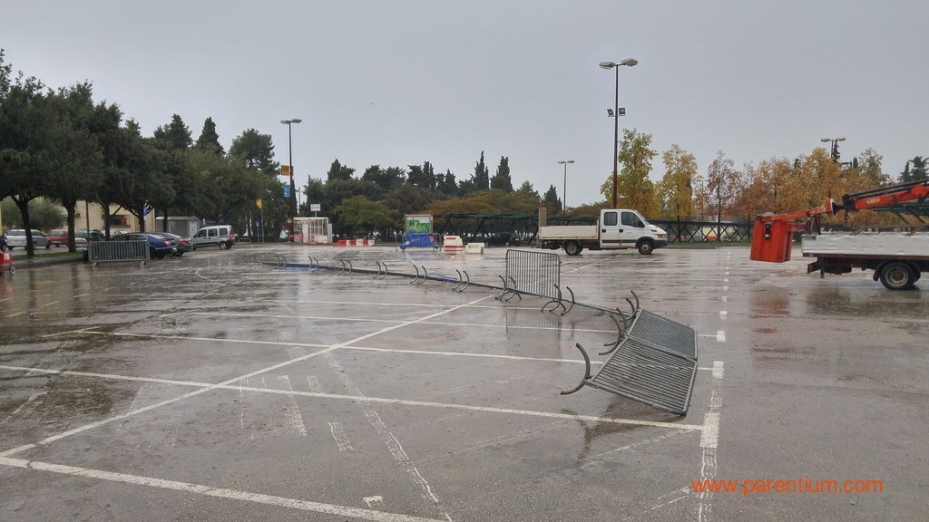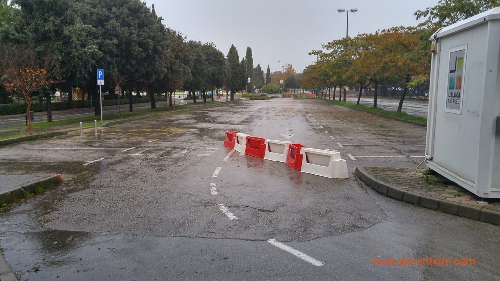 Iako je, prema najavama, trebalo biti otvoreno od ponoći, veliko gradsko parkiralište kod porečke tržnice korisnicima je u nedjelju ujutro i nadalje bilo nedostupno, zbog čega smo i mi ove kišne nedjelje bili prisiljeni parkirati u obližnjim blatnjavim Vrtovima. Sigurnosne ograde priječile su ulaz na parkiralište sa kojeg još uvijek nisu uklonjeni montažna bina niti drugi rekviziti za automobilističku utrku.